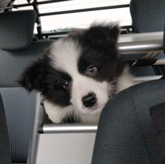 Jette hat eine neue Box im Auto. Anfangs fahre ich in der Box, später soll ich in den Kofferraum umziehen. Die ersten 3 Fahrten habe ich lautstark protestiert: ich will lieber wieder auf Jettes Schoß fahren! Das war viel weicher und Körperkontakt mag ich eh! Nachdem das Jammern nichts geholfen hat, habe ich mich mit der Situation abgefunden und schaue nun lieber vorne raus.